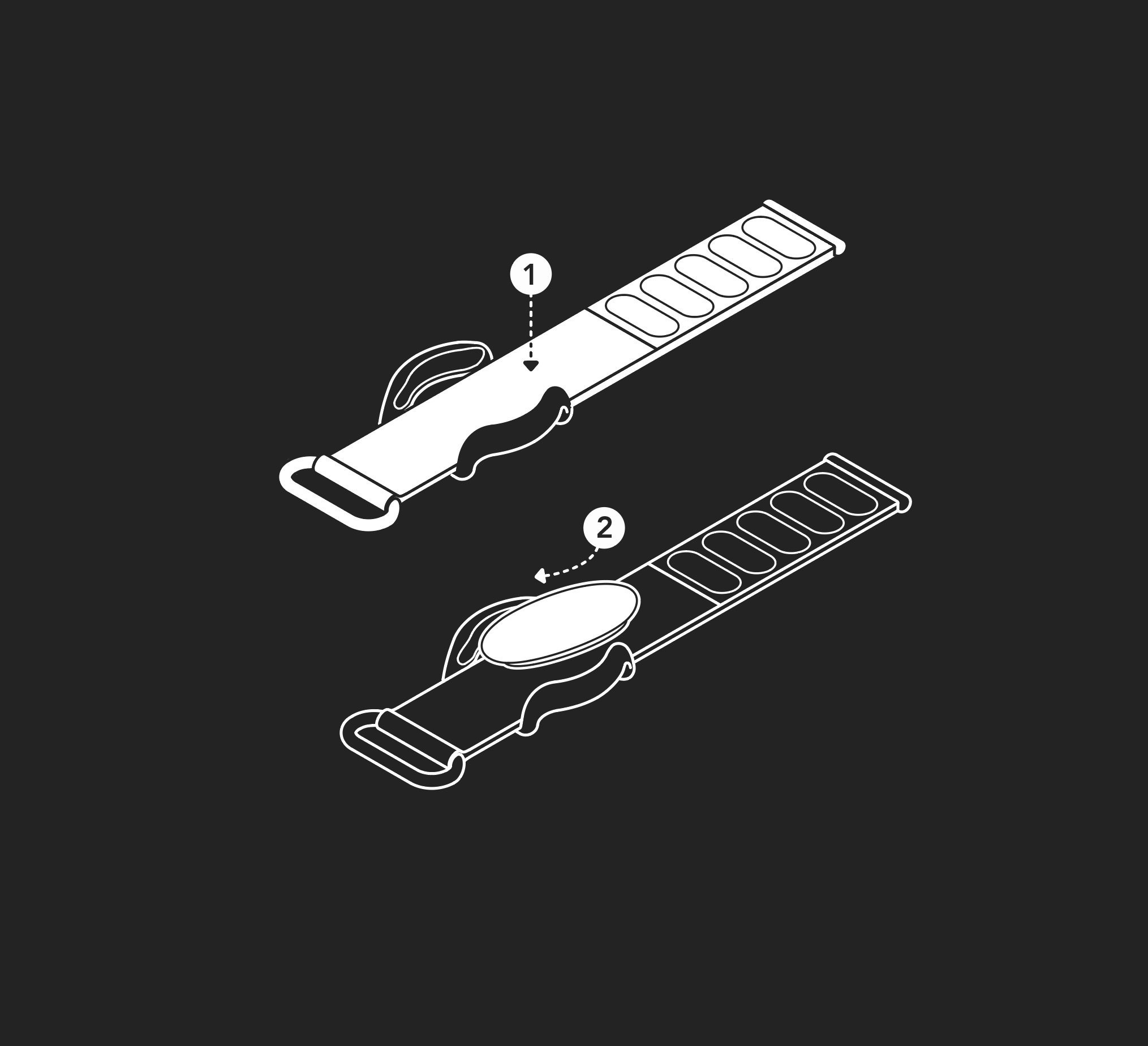 Just place the strap over the frame and push in the Airtag.